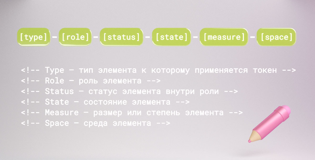 Для нейминга в дизайн-системе мы приняли конструкцию, которая подходила под любой элемент. Это было нужно не только для наведения порядка в макетах, но и для того, чтобы сделать интерфейс более управляемым, подготовить его к дальнейшему развитию и упростить перенос решений в код.
