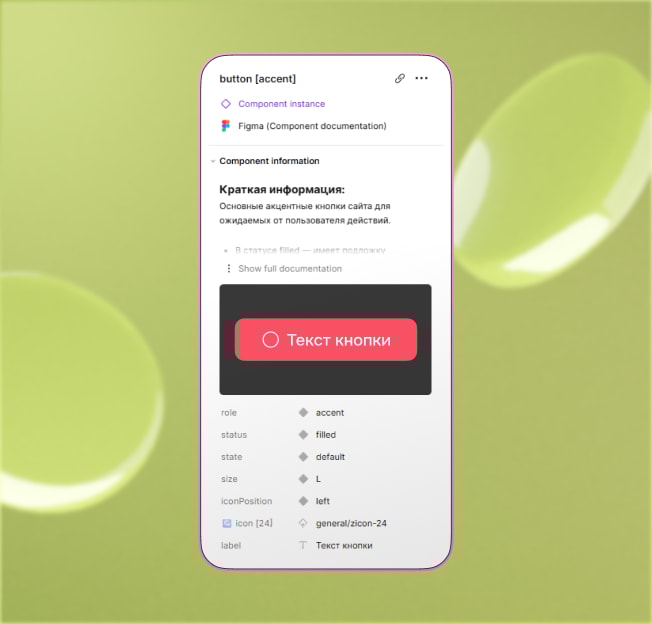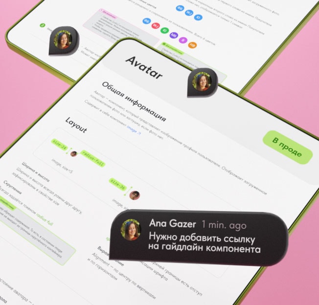 Ещё один большой пласт работы — гайдлайны. Мы описывали не только внешний вид компонентов, но и правила их использования, ограничения, поведение в разных состояниях. При этом документацию старались делать одинаково структурированной и понятной для разных участников процесса, используя общепринятые в команде термины. Отдельно выносили комментарии для дизайнеров и для разработчиков, чтобы каждая сторона быстрее находила релевантную информацию и меньше тратила времени на уточнения.